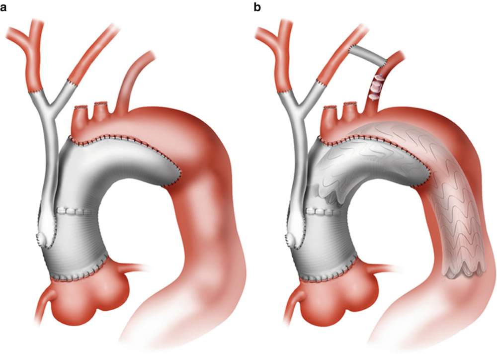 ჰიბრიდული ტიპის ოპერაციები - სხვადასხვა გართულებით მიმდინარე მწვავე აორტალური სინდრომისას, წარმოადგენს ერთადერთ სასწრაფო გადაუდებელ ეტაპობრივ ჩარევას, რომლებიც ამცირებენ სიკვდილიანობის უაღრესად მაღალ მაჩვენებლებს, ურგენტულ შემთხვევებში და გამოირჩევა კარგი კლინიკური და შორეული შედეგებით. აღნიშნული ტიპის ოპერაცია, კერძოდ - ბრაჰიოცეფალური ტოტების სრული „დებრანჩინგი“, რკალის, დასწვრივი აორტის ენდოპროტეზირება, ჩატრადა პირველად ნ.ბოხუას სახ. კარდიოვასკულურ ცენტრში, ასევე უნდა აღინიშნოს, რომ ეს კლინიკური შემთხვევა იპყრობს ყურადღებას იმით, რომ დაგემილი ჰიბრიდული ოპერაცია წარიმართა ურგენტულად დასწვრივი ანევრიზმის რუპტურის ფონზე. ამრიგად, ქირურგიული და ენდოვასკულური ტექნიკის კომბინაციის საშულებით შესაძლებელია ნებისმიერი ტიპის ანატომიური დაზიანების კორექცია, ნაკლები ქირურგიული რისკისა და შორეული გართულებების პრევენციით, რაც ცხადია ახალი სიტყვაა ჩვენი ქვეყნის კარდიოასკულურ ქირურგიაში.